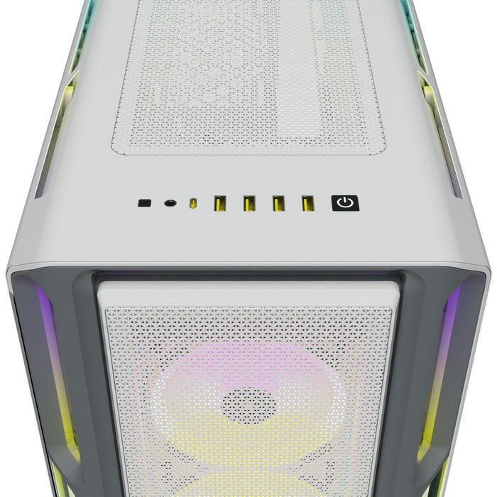 Corsair iCUE 5000T RGB. Form factor: Midi Tower, Type: PC, Product colour: White. Supported power supply form factors: ATX. Front fans installed: 3x 120 mm, Front fans diameters supported: 120,140 mm, Rear fans diameters supported: 120 mm. Supported HDD sizes: 2.5,3.5", SSD form factor: 2.5". Width: 251 mm, Depth: 530 mm, Height: 560 mm