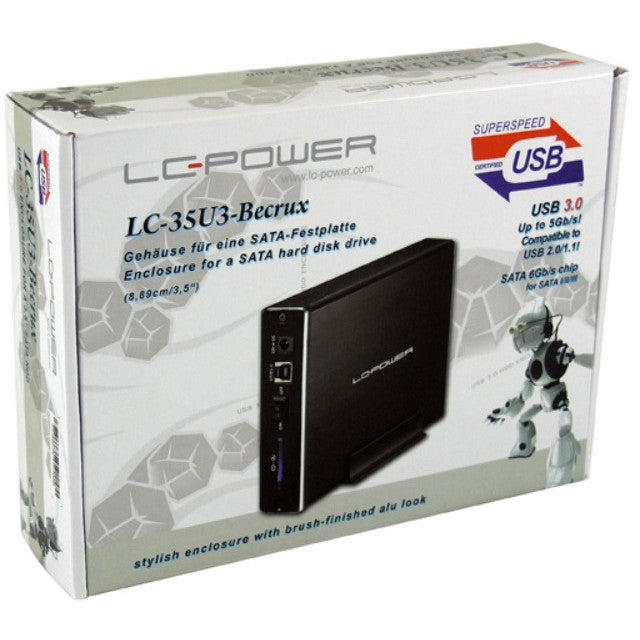 LC-Power LC-35U3-Becrux. Number of storage drives supported: 1, Storage drive size: 3.5", Supported storage drive interfaces: Serial ATA, Serial ATA II, Serial ATA III. Data transfer rate: 5 Gbit/s. Product colour: Black
